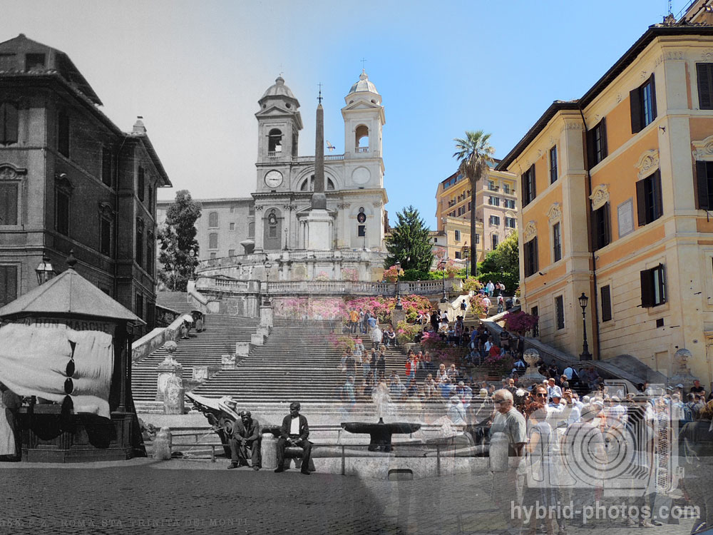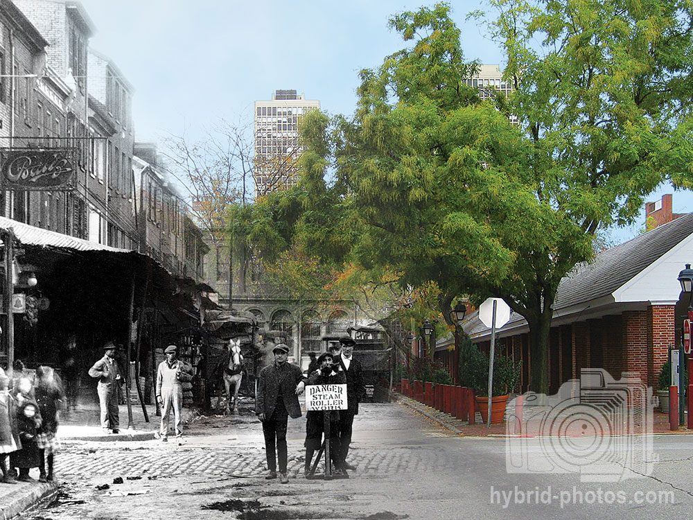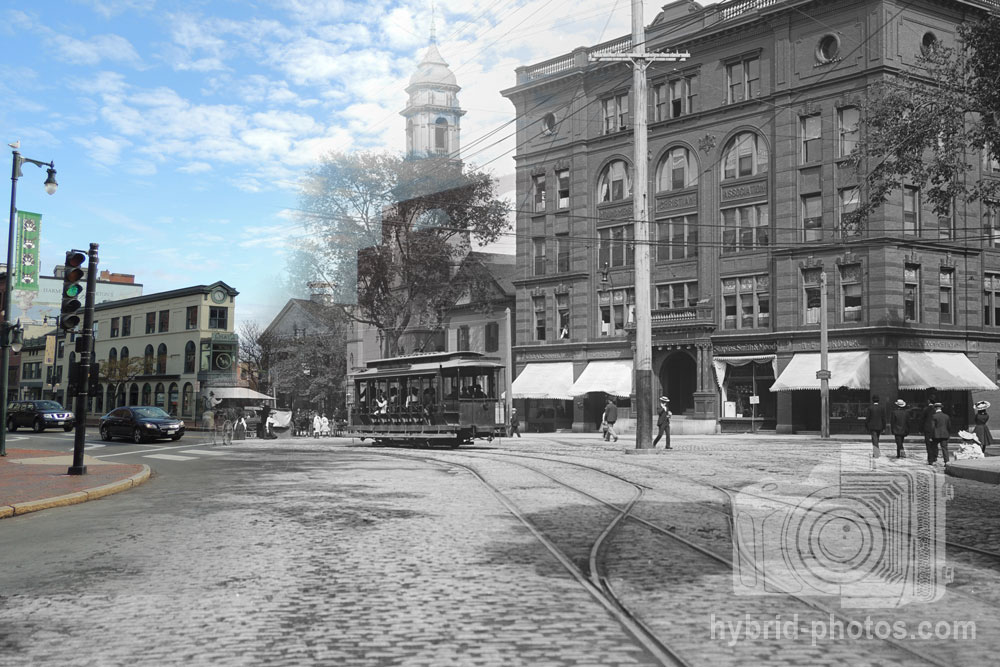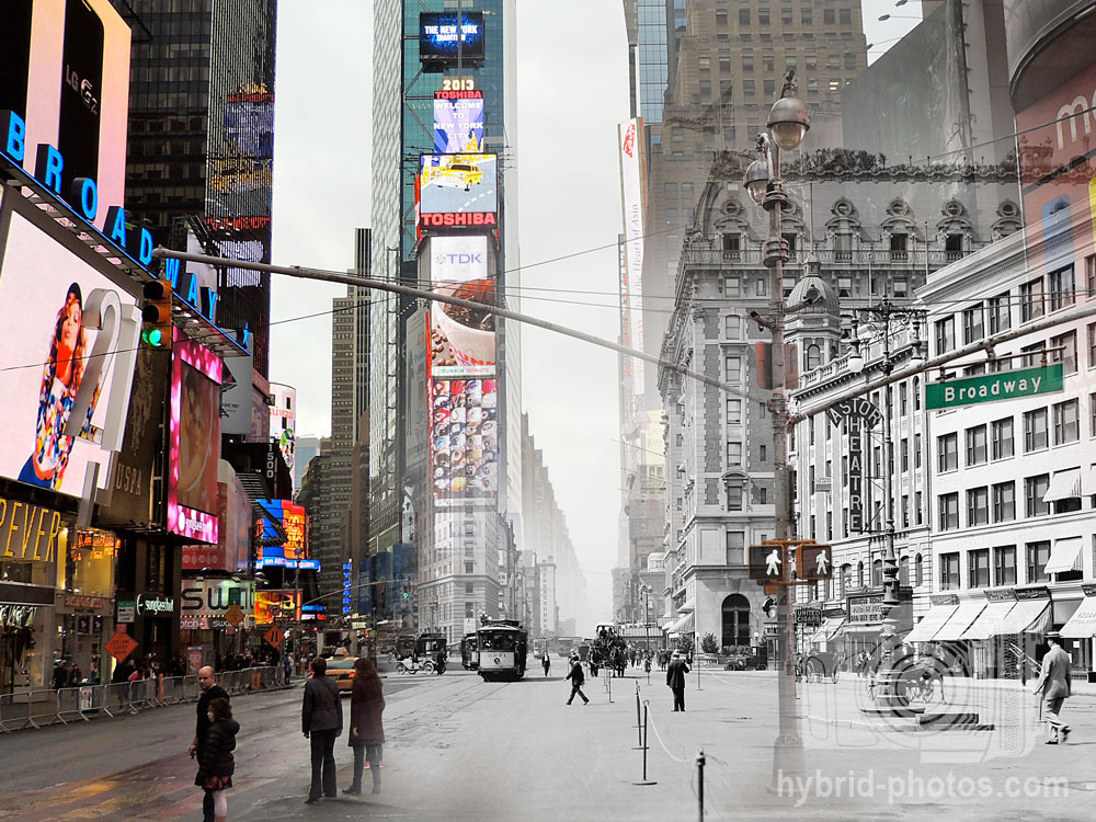 Hybrid Photos is a different take on the before and after concept. I take historic photographs and digitally merge them with current photos I’ve taken from the exact same location. Same exact spot, completely different eras.